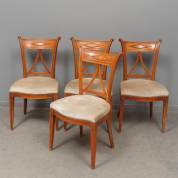 Set van vier iepen eetkamerstoelen, de bovenregel gesneden met ruitvorm waarbinnen parelrand, de opengewerkte rug met twee gebogen spijlen, en de zitting met lichtgroen fluweel bekleed, de onderregel van één stoel gemerkt 'W' welke hoogst waarschijnlijk staat voor Stadhouder Willem V (1748-1806) uit de inventaris van Paleis het Loo, en zijn verkocht in Den Haag op een veiling in 1796 en 1798, drie stoelen gemerkt met initiaal 'D', Louis Seize, 90 × 45,5 × 41,5 cm