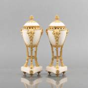 Paar marmeren en verguld bronzen cassolettes, de coupes omringd door drie ramskoppen, uitlopend in hoeven, Frankrijk, laatste kwart 18e eeuw -één deksel gelijmd, het andere met chips en restauraties langs de rand-, 29 × Ø 11 cm, herkomst: Sotheby's