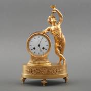 Kleine vuurvergulde beeldpendule: de jonge Bacchus met kelk in zijn hand, de geëmailleerde wijzerplaat met Romeinse cijfers, op het basement een palmet eindigend in pijnappels, niet gemerkt, Frankrijk, eerste helft 19e eeuw, 30 × 19 × 11 cm