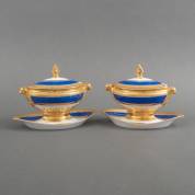 Twee klein formaat dekselterrines met blauw-goud decor van palmetbladeren en leeuwvormige handvatten, Frankrijk, circa 1800 -decoratie sleets-, 17,5 × 24,5 × 13 cm