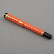 Koraalrode vulpen met 18kt gouden punt, in houten presentatiedoos, model Duofold, uitvoering Parker -gebruikssporen doos met in de hoek een plaquette met opdracht-