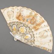 Waaier met opengewerkte parelmoer baleinen, het papier met handgeschilderd decor: rustende Artemis met gezelschap in klassiek Grieks landschap, Frankrijk, eind 18e eeuw, in doosje -één balein gebroken-, uitgeklapt 28 × 50 cm