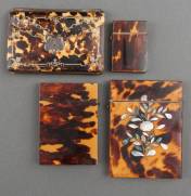 Twee schildpadbelijmde visitekaarthouders, tondeldoosje en een etuitje, 19e eeuw -etui met defecten-, grootste 10 × 7,5 cm