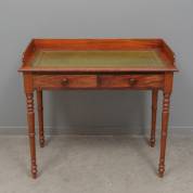 Mahonie schrijftafel met olijfgroen lederen blad, twee lades en gedraaide poten, Engeland, eind 19e eeuw, 86 × 96 × 50 cm