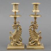 Paar messing kandelaars in de vorm van griffioenen, eind 19e eeuw, hoogte 24 cm