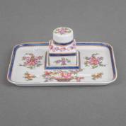 Porseleinen inktstel gedecoreerd met bloemenmand en strooiboeketjes, Samson, Frankrijk, 19e eeuw, 7 × 22 × 16 cm