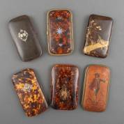 Zes verschillende sigarenkokers van diverse materialen, waaronder vernis martin, schildpad en Japans lakwerk, 19e eeuw, circa 14 × 7 cm