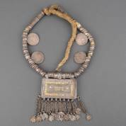 BWZG amulethanger aan ketting van touw met BWZG kralen en vier Theresia Thaler munten, Oman, amulethouder 10,5 × 6 cm