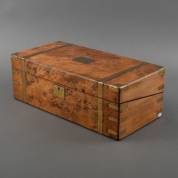 Wortelnoten schrijfkist, met koperen monturen, het schrijfblad met groen leder, daarnaast vakjes voor inktpotten en schrijfbenodigdheden, Engeland, 19e eeuw -gebruikssporen-, 50 × 24 × 17 cm