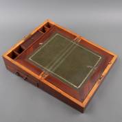 Mahonie schrijfkist, het schrijfblad met groen leder, daarnaast vakjes voor inktpotten en schrijfbenodigdheden, Engeland, 19e eeuw, 18 × 44 × 27 cm