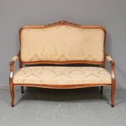 Notenhouten tweezits bankje met lichtgele stoffen bekleding, 19e eeuw -kleine vlekjes-, 110 × 120 × 65 cm