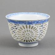 Chinees porseleinen 'duivelswerk' kommetje met opengewerkte buitenwand met chrysantendecor en blauw-wit decor van bloemenvazen, gemerkt met artemisiablad, Kangxi -paar randchips-, 5,5 × Ø 8 cm