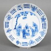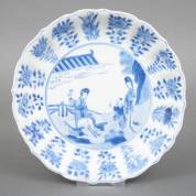Chinees porseleinen gelobd bordje met gecontourneerde opstaande rand en blauw-wit 'five scholars' decor, Chenghua gemerkt, Kangxi -barst, haarlijn, randdefecten-, Ø 17 cm