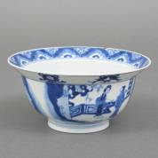 Chinees porseleinen klapmutskommetje met blauw-wit decor: twee scènes uit de The Romance of the Western Chamber, Chenghua gemerkt, Kangxi -chip met haarlijn en een los haarlijntje-, 7,5 × Ø 16 cm