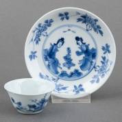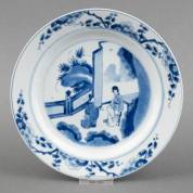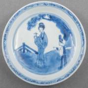 Chinees porseleinen bord met blauw-wit decor van twee figuren, vermoedelijk een scène uit de Romance of the Western Chamber, Kangxi gemerkt en periode -haarlijn-, Ø 20,7 cm