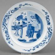 Chinees porseleinen bord met blauw-wit decor van vier figuren op een terras, vermoedelijk een scène uit de Romance of the Western Chamber, Kangxi gemerkt en periode, Ø 20,5 cm