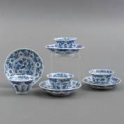 Vier Chinees porseleinen kommetjes en vier schoteltjes met gelijkende blauw-witte florale decors, Kangxi -twee schoteltjes en één kommetje gelijmd, twee schoteltjes en één kommetje met randdefecten-, schoteltje Ø 10 cm
