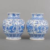 Paar Chinees porseleinen vazen met blauw-wit decor bloemen en vogels, Kangxi gemerkt, eind 19e eeuw -randchips-, 23 × Ø 19 cm