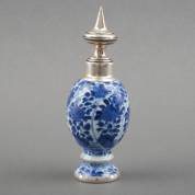 Chinees porseleinen theebusje met blauw-wit bloemdecor en 2e gehalte zilveren montuur, Kangxi, gemerkt met artemisiablad -randschilfers van knoop bij voet-, hoogte inclusief dop 18cm