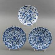 Drie Chinees porseleinen borden met floraal decor, Kangxi -één gelijmd-, Ø 22 cm