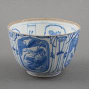 Chinees kraakporseleinen kraaienkom met blauw-wit decor van vogels en rotslandschappen in cartouches, Wanli -craquelé, barst en chips, mist deksel-, 9 × Ø 13,7 cm