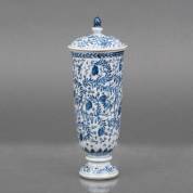 Hoge Chinees porseleinen bedekte wijnbeker met blauw-wit decor van bloemtakken, Kangxi -beker gelijmd, knop deksel gerestaureerd-, hoogte 21 cm