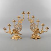 Paar verguld metalen vijflichts kandelaars rijk geornamenteerd met draken en omringd door bloem- en bladmotieven, rond 1900, 53 × 44 cm