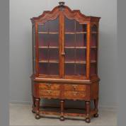 Wortelnotengefineerde porseleinkast op onderstel met laden, de beglaasde deuren met roedeverdeling, Louis Quatorze-stijl -herstellingen-, 210 × 133 × 36 cm