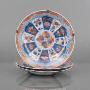 Drie Chinees porseleinen Imari borden met centraal granaatappeldecor en daaromheen diverse planten in lotusvormige cartouches, 18e eeuw -randchipjes, twee met haarlijnen in de rand-, Ø 23,5 cm