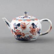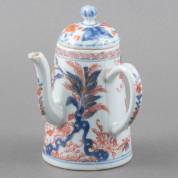 Chinees porseleinen Imari schenkkan met haaks geplaatst oor, afwijkende deksel, en floraal decor, 18e eeuw -defecten-, hoogte 14,5 cm