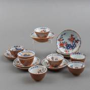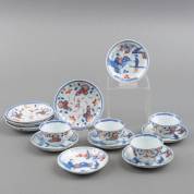 Vier Chinees porseleinen Imari kommetjes en schoteltjes met floraal decor, 18e eeuw, en zes Chinees porseleinen Imari schoteltjes met figurendecor, 18e eeuw -defecten-