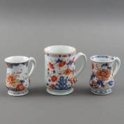 Grote Chinees porseleinen Imari bierpul, hoogte 15,5 cm, en twee kleinere bierpullen, hoogte 12,5 cm, alle 18e eeuw -defecten-