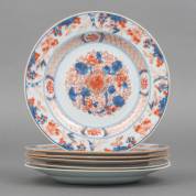 Zes Chinees porseleinen Imari borden met floraal decor, 18e eeuw -één met afwijkend randdecor, enkele randchips, drie met haarlijnen-, Ø 22,5 cm
