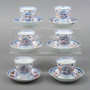 Zes Chinees porseleinen Imari cacaokommen en zes schotels met decor van landschappen in cartouches, 18e eeuw -twee schotels afwijkend, randchips, twee kommen en twee schotels met haarlijnen-, 7,5 × Ø 14 cm