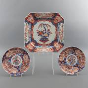 Twee Japans porseleinen Imari schotels met floraal decor, en vierkante Japans porseleinen Imari schaal met afgeschuinde hoeken met floraal decor, 19e/20e eeuw -een ronde schotel met chip en vierkante schaal met randschilfers en chipje-, vierkante schotel 39 × 39 cm