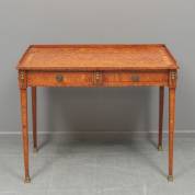 Schrijftafel met twee lades en opstaand randje, geheel belijmd met parqueterie van rozenhout, eind 18e/19e eeuw -krimpscheur in blad, lichte fineerschade-, 75 × 96 × 49 cm