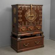 Koreaanse theekast/huisaltaar op onderstel, met boven een klepdeur met messing decor van gedicht over familiegeluk, geflankeerd door een wassende- en volle maan, de twee deuren met aan de binnenzijde ieder vijftien lades, het interieur met messing tekst en compartiment, waaronder een lade met messing vlinderbeslag en één lade in het onderstel, 20e eeuw -droogtescheur in een deur en deuren sluit niet meer goed-, maat opengeklapt 192 × 196 × 63 cm