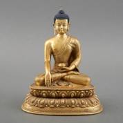 Verguld bronzen Boeddha in bhumisparsha mudra, gezeten op dubbele lotustroon, vermoedelijk circa 1900, hoogte 24 cm