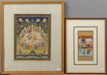 Twee Indiase schilderingen op papier, één met dansende figuren, grootste 23,5 × 18 cm