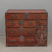 Japanse Tansu reiskist met ijzeren beslag, 6 laden en achter het deurtje nog drie verborgen laden, circa 1890 -gebruikssporen-, 90 × 106 × 42 cm