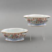 Paar Chinees porseleinen schaaltjes met gecontourneerde rand en famille rose decor: aan de ene kant optocht van figuren met lampions bij altaar, aan de andere kant drakendans, Tongzhi zegelmerk en periode -één met chipje van standring-, 7 × 19,5 × 13,5 cm, herkomst: veiling Christie's 19-11-1996