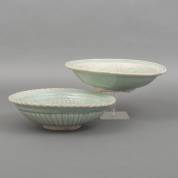 Twee celadon schalen met reliëfdecor: één met bloemdecor -restauratie in rand-, de andere met abstract bloemdecor -barst-, Sukothai, Thailand, 14e-16e eeuw, Ø 34 en Ø 32 cm