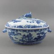 Chinees porseleinen dekselterrine met blauw-wit decor van pagodes in landschap, de knop in de vorm van een bloem en de handgrepen in de vorm van varkenshoofdjes, Qianlong -één bloemenstengel en één varkensoortje gebroken-, 20,5 × 34 × 24 cm