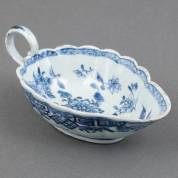 Chinees porseleinen sauskom met plooirand en blauw-wit bloemdecor, Qianlong -randchip en glazuurschilfertjes-, 7,5 × 20 × 11,5 cm