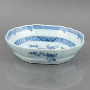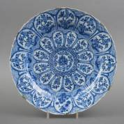 Chinees porseleinen schotel met blauw-wit decor: centraal een lotus, daaromheen bloemen in vakverdeling, gemerkt met artemisiablad, Kangxi -enkele randchips-, Ø 39 cm