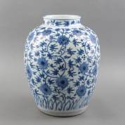 Chinees porseleinen lotuspot met blauw-wit decor van lotussen, Wanli, hoogte 42 cm
