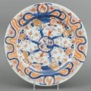 Chinees porseleinen Imari schotel met bloemdecor omgeven door vrij gevormde rand, Kangxi/Yongzheng, lingzhi gemerkt -schilfers van standring-, Ø 35,5 cm