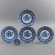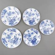 Vijf Chinees porseleinen borden met identiek blauw-wit vogel- en bloemdecor maar in drie verschillende formaten, Chenghua gemerkt, 19e eeuw -een grote met bodembarst; een kleine bijna geheel doormidden gebarsten; randdefecten-, 2× Ø 29 cm, 2× Ø 25,5 cm, 1× 23 cm