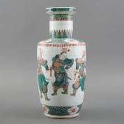 Chinees porseleinen famille verte rouleau vaas met decor van krijgers, laat 19e eeuw, hoogte 43,5 cm, herkomst: particuliere verzameling Amsterdam