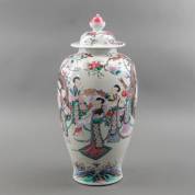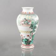 Chinees porseleinen famille verte meiping vaas met decor van een scène uit de Romance of the Western Chamber, waarin Cui Yingying en haar attendant in de tuin luisteren naar Zhang Sheng die de qin bespeelt, 19e eeuw -gerestaureerd-, hoogte 40,5 cm, herkomst: particuliere verzameling Amsterdam